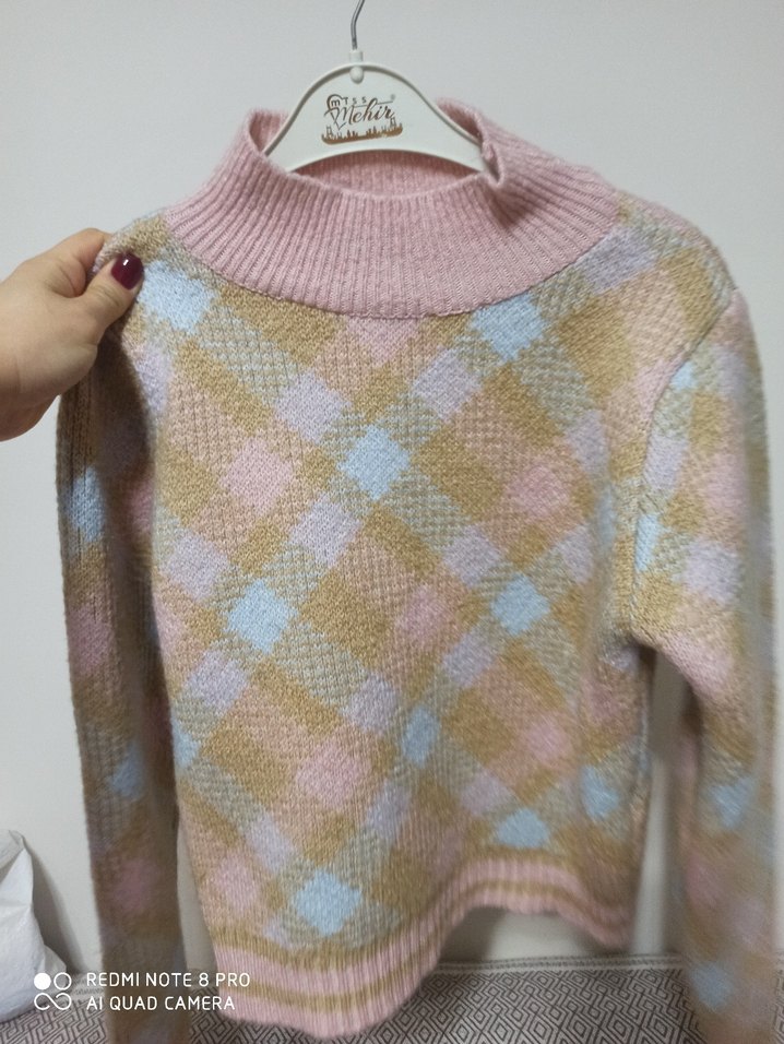 Örgü yapılı, boğazlı ve uzun kollu kadın kazak. Pembe pastel tonlarda bağlama desenli çok kalın bir kazak