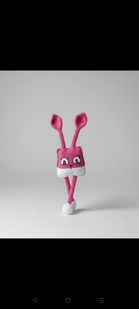 Pembe renkli, uzun kulaklı ve sevimli yüzlü örgü peluş oyuncak, yumuşak iplikten yapılmıştır.