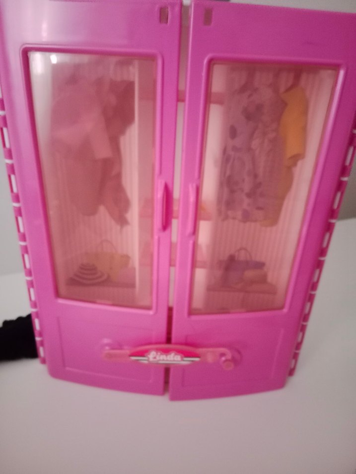 Canlı pembe renkte, şeffaf kapaklı çocuk dolabı. İki kapaklı ve kolay açma kulplu.