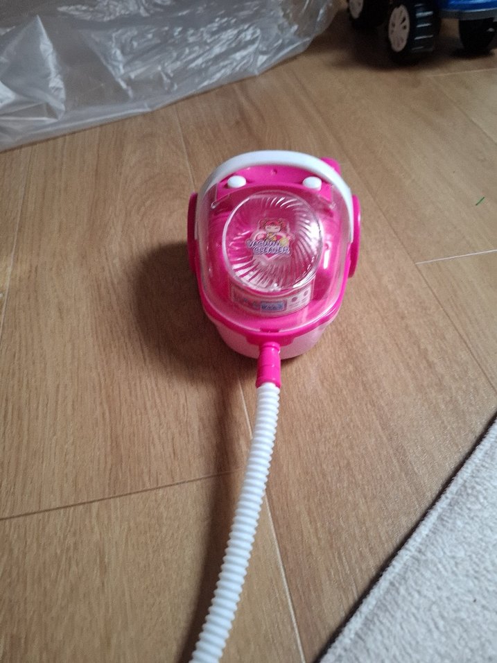 Pembe renkli oyuncak elektrikli süpürge, esnek hortum ve kompakt tasarıma sahiptir. Üst kısmında şeffaf kapak bulunur pjl kismi calismiyor.