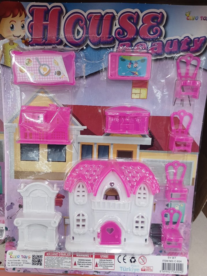 Canlı pembe renkte oyuncak ev seti, küçük sandalyeler, masa ve fırın gibi minyatür mobilyalar içerir.