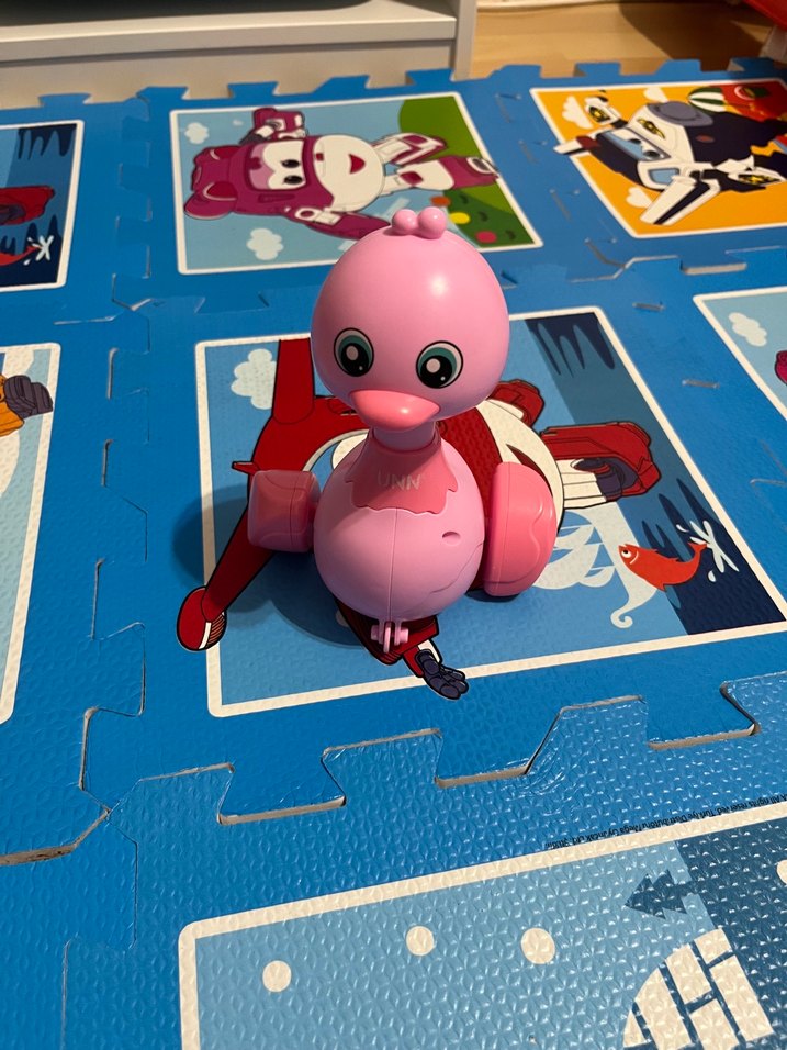 Hareketli parçaları olan, pembe renkli ve sevimli kuş tasarımlı renkli oyuncak figür. Kafasina baktiginizda ördek gibi yürüyor