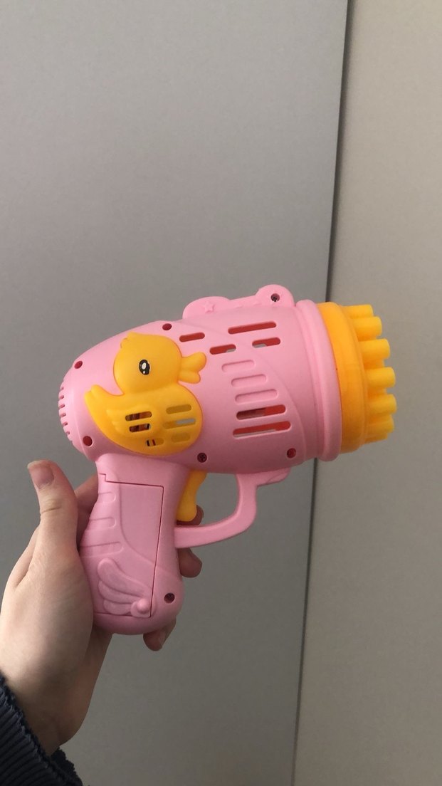 Pembe renkli oyuncak tabanca, sarı ördek detayı ve parlak sarı namlu ucu ile oyun keyfi sunar. Suyu yok tek tabancadır