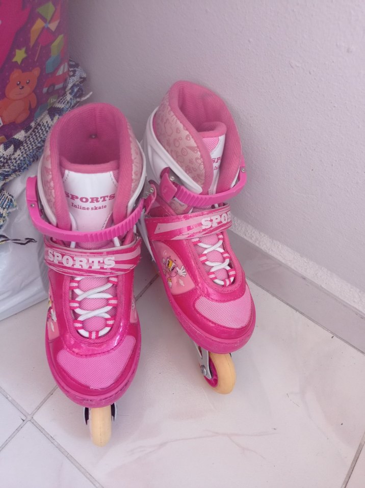 Pembe renkli, desenli paten ayakkabısı, bağcıklı ve bantlı, tekerlekli, sokak stili ve spor tarzına uygun. 38 ve 40 numaraya uygun yandaki düğme ile büyüyor.