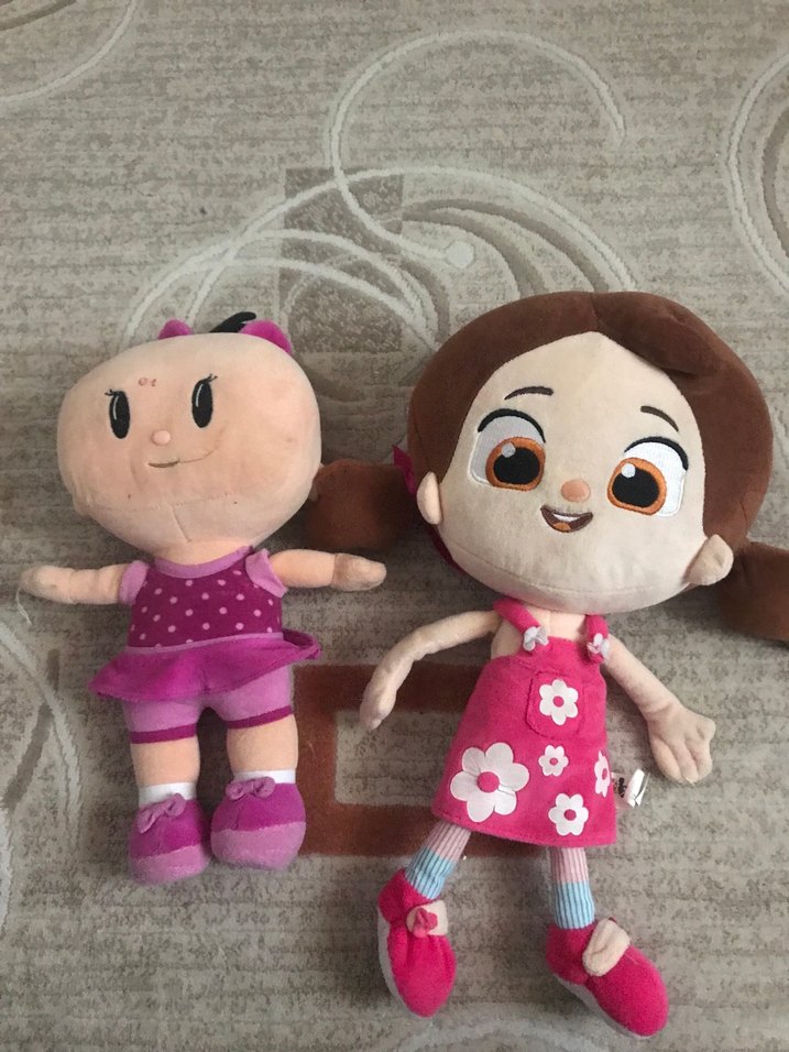 İki adet pembe kıyafetli, yumuşak kumaştan yapılmış renkli peluş oyuncak bebekler. İkisi birlikte