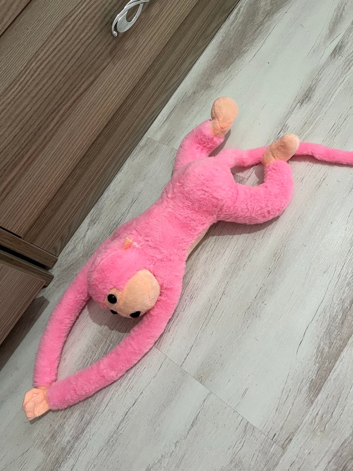 Yumuşak ve renkli pembe peluş maymun oyuncak, uzun kolları ve bacakları ile sarılmak için uygun.
