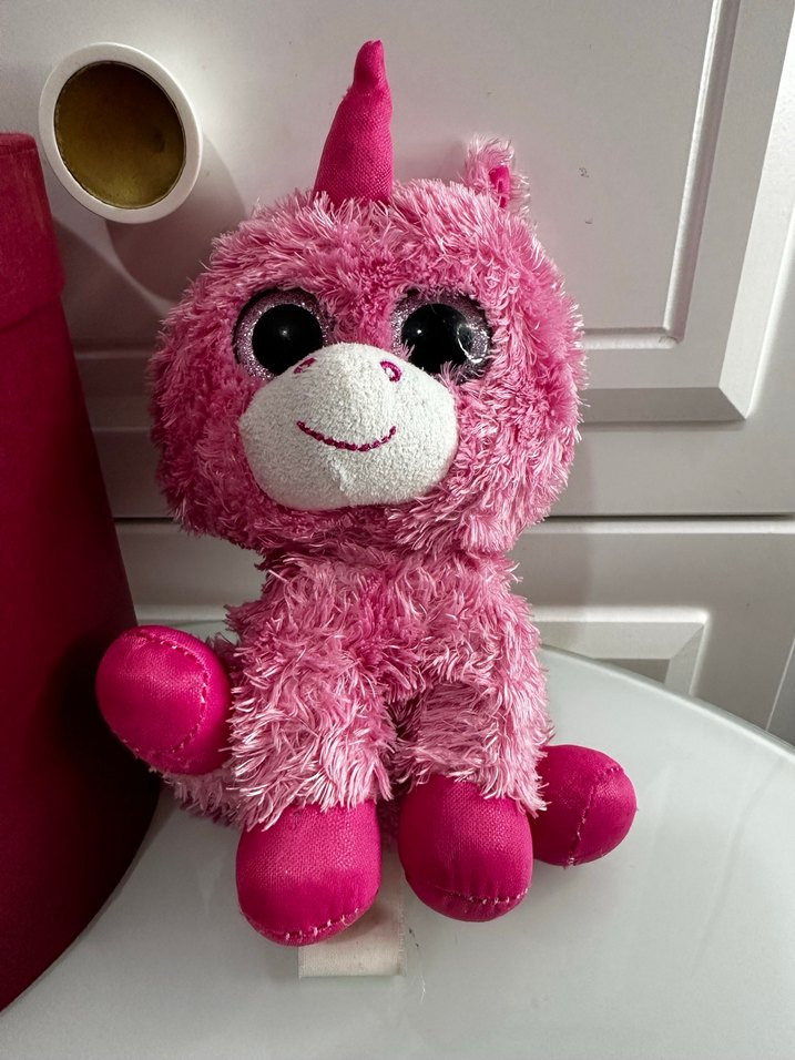 Yumuşak ve renkli pembe peluş unicorn oyuncak, büyük gözler ve gülümseyen yüze sahip.
