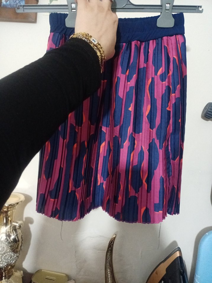 Pembe ve lacivert tie-dye deseniyle renkli, pilili mini etek. Sentetik kumaştan, bol kesim ve günlük kullanıma uygun.
