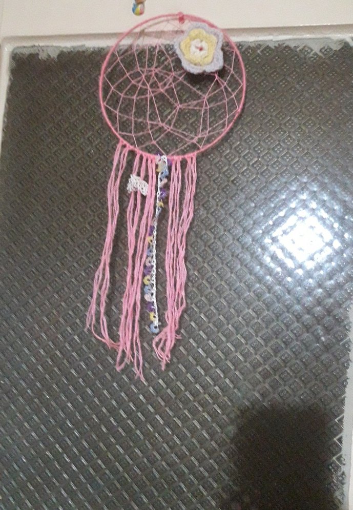 Pembe renkli örgü halkaya sahip, renkli ipler ve küçük çiçek detaylı rüya kapanı dekorudur. Ev dekoruna şirin bir dokunuş katar.