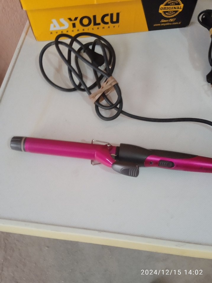 Pembe renkte saç maşası, renkli tasarıma sahip ve kablo ile birlikte. ASYOLCU markalıdır.
