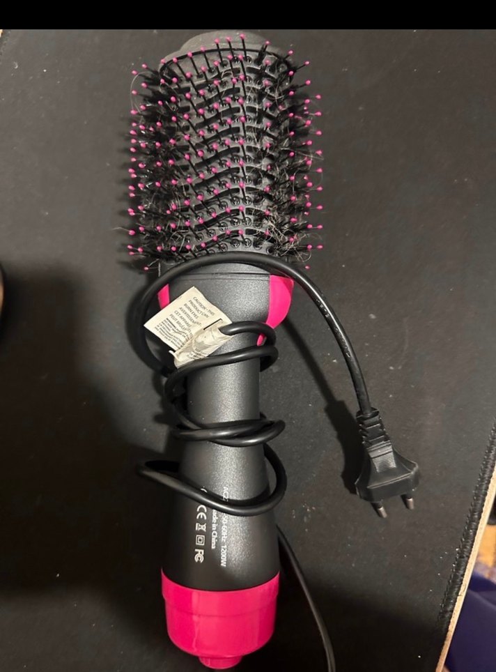 Pembe renkli, elektrikli saç şekillendirici fırça, renkli uçlarıyla saçları kolayca şekillendirir. Hiçbir sorunu yoktur