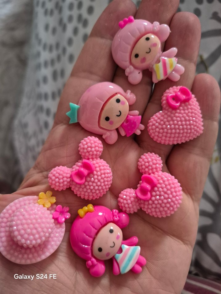 Pembe renkli, sevimli bebek ve kalp figürlü renkli süsleri, kıyafetlere ve toklara eğlenceli bir dokunuş katar.