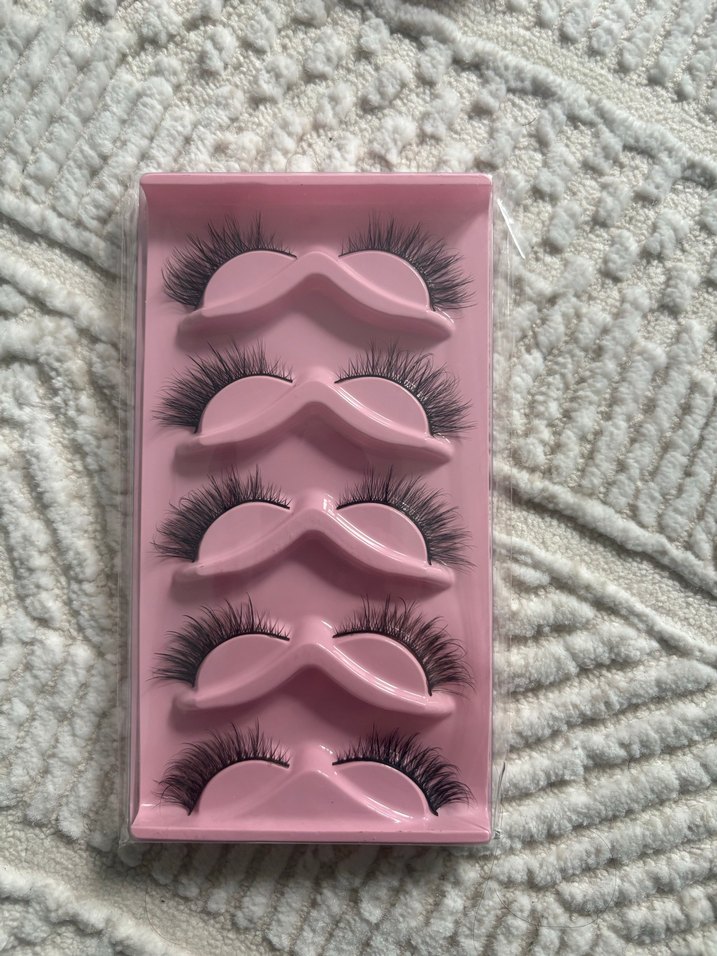 Doğal ve hacimli görünümlü pembe renkli takma kirpik seti. Birden fazla çift içerir, tekrar kullanıma uygundur.