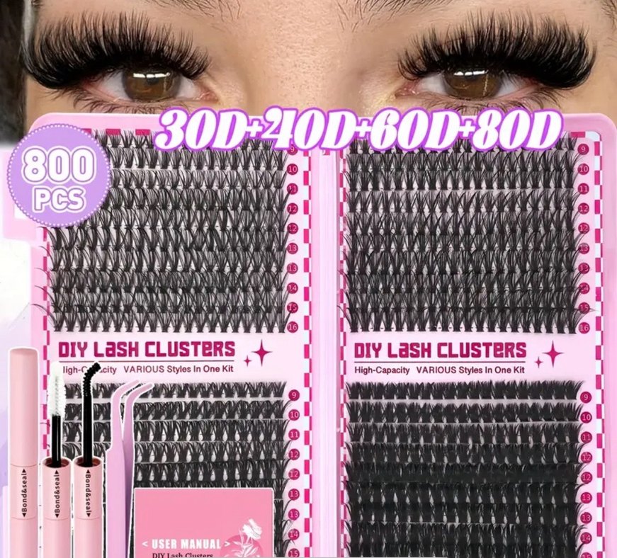 30D, 40D, 60D ve 80D dahil çeşitli küme stillerinde açık pembe takma kirpik seti, DIY uygulama için kullanım kılavuzlu.