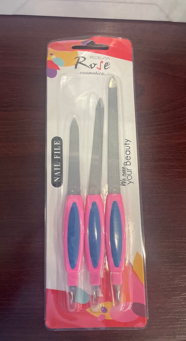 Renkli pembe saplı üçlü tırnak törpüsü seti, tırnakları şekillendirmek ve düzeltmek için uygundur. Cosmelic markalı.