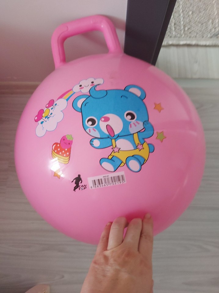 Pembe renkte, tutacaklı zıplayan top. Üzerinde mavi ayı, gökkuşağı ve dondurma desenleri bulunur. Aktif oyun için uygundur.