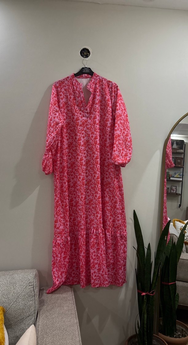 Renkli desenli, uzun kollu, bol kesimli pembe uzun elbise. Etek kısmında fırfır detaylarıyla tarzda günlük kullanım için uygun.