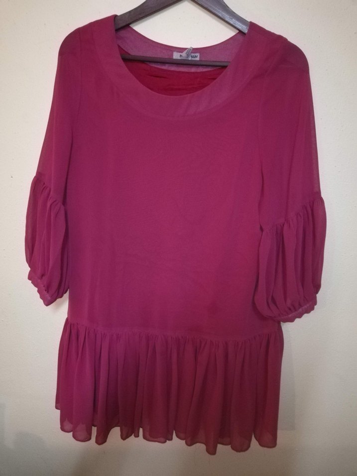 Bu koyu pembe bohem tunik, uzun kollarda fırfır detayları ve bol kesimiyle yumuşak sentetik kumaştan yapılmıştır. Bisiklet yaka ve midi boydadır, günlük kullanıma uygundur.