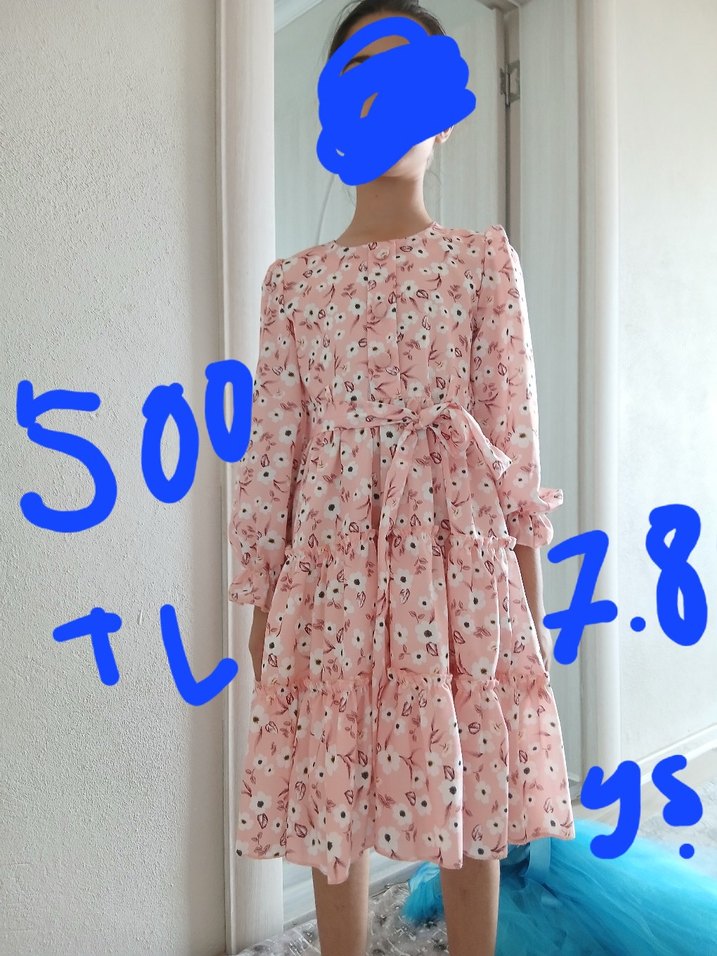 Pembe pastel renkli, uzun kollu, yuvarlak yakalı Bu bayramda tek giydi bir iki saatliğine sevmiyor giymek istemiyor marka temsilidir