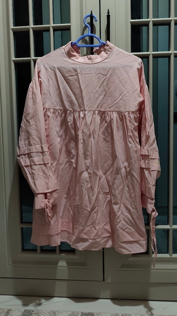 Bu bol kesim, uzun kollu ve yüksek yakalıdır. Pembe pastel renkte, yumuşak keten kumaştan üretilmiş, günlük kullanım için uygundur. Sadece biraz kırışık fotoğraf ta