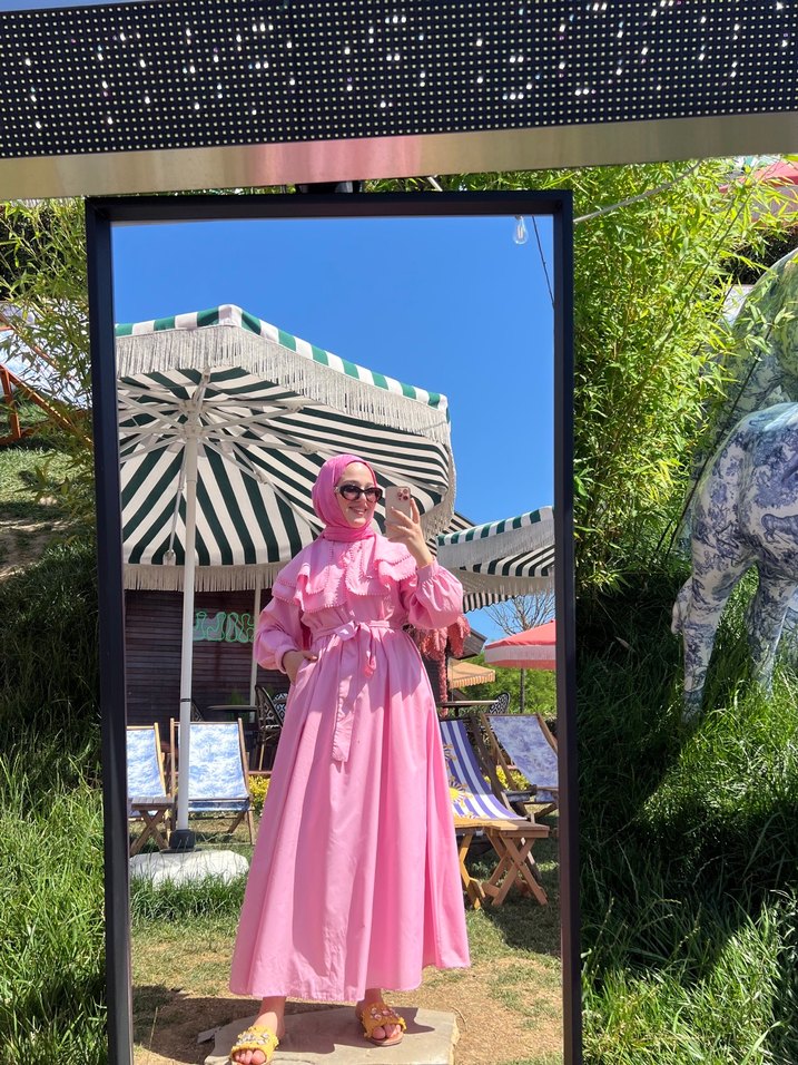 Pembe renkli, bol kesim uzun elbise, fırfır detaylı, yüksek yakalı ve askılı kollu. Yumuşak sentetik kumaştan, pastel tonlarda batik desenli, günlük kullanım için uygun.