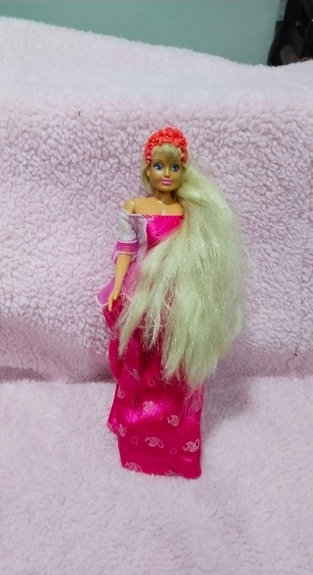 Uzun sarı saçlı, kırmızı taçlı ve desenli pembe elbiseli renkli bebek. hareket etmesinde herhangi bir sorun yok eski seri barbie
