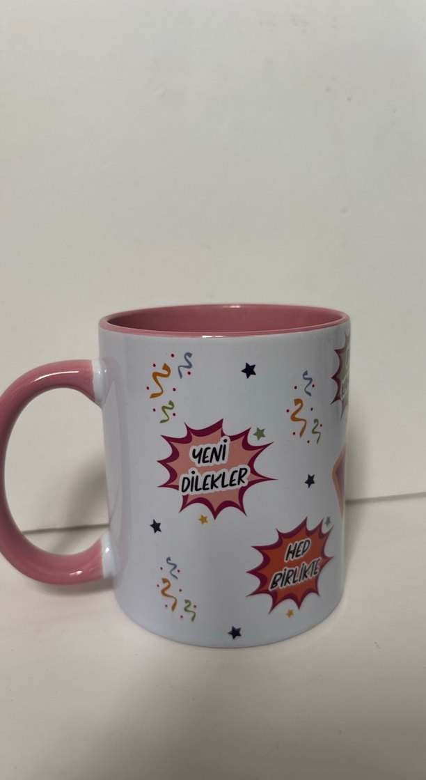 Pembe sap ve iç kısmı olan, "Yeni Dilekler" ve "Hep Birlikte" yazılı renkli desenlere sahip kupa. İçi pembe renktir.