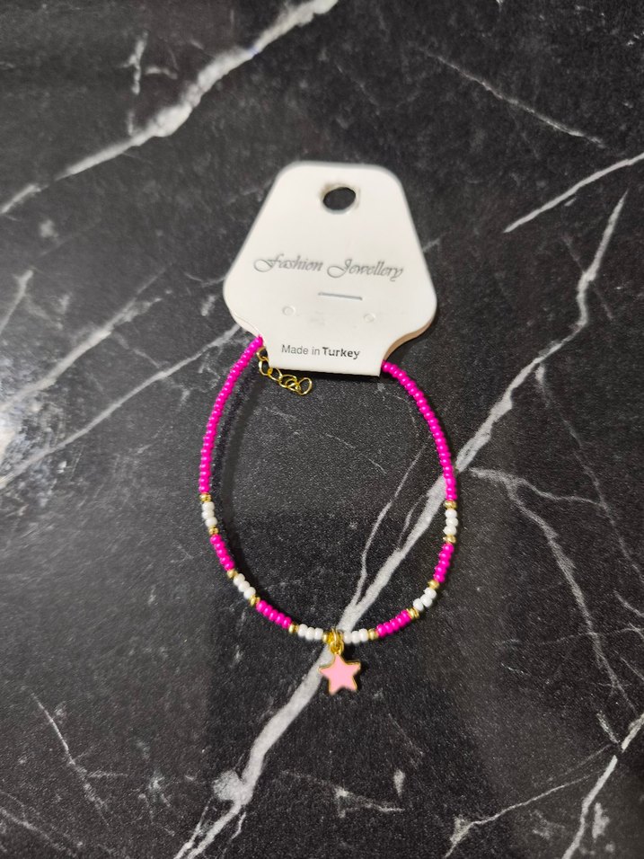 Pembe boncuklardan oluşan, pembe yıldız figürlü kız çocuk/kadın bileklik. Günlük kullanıma uygun.Takasa açığım. İstenirse indirim yapabilirim.