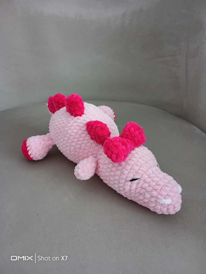 Yumuşak dokulu pembe peluş oyuncak, renkli detaylara sahip. Dokunması rahat ve süsleme ya da hediye olarak kullanılabilir. 28 cm boyunda kadife ipten orulme yatan dinozor