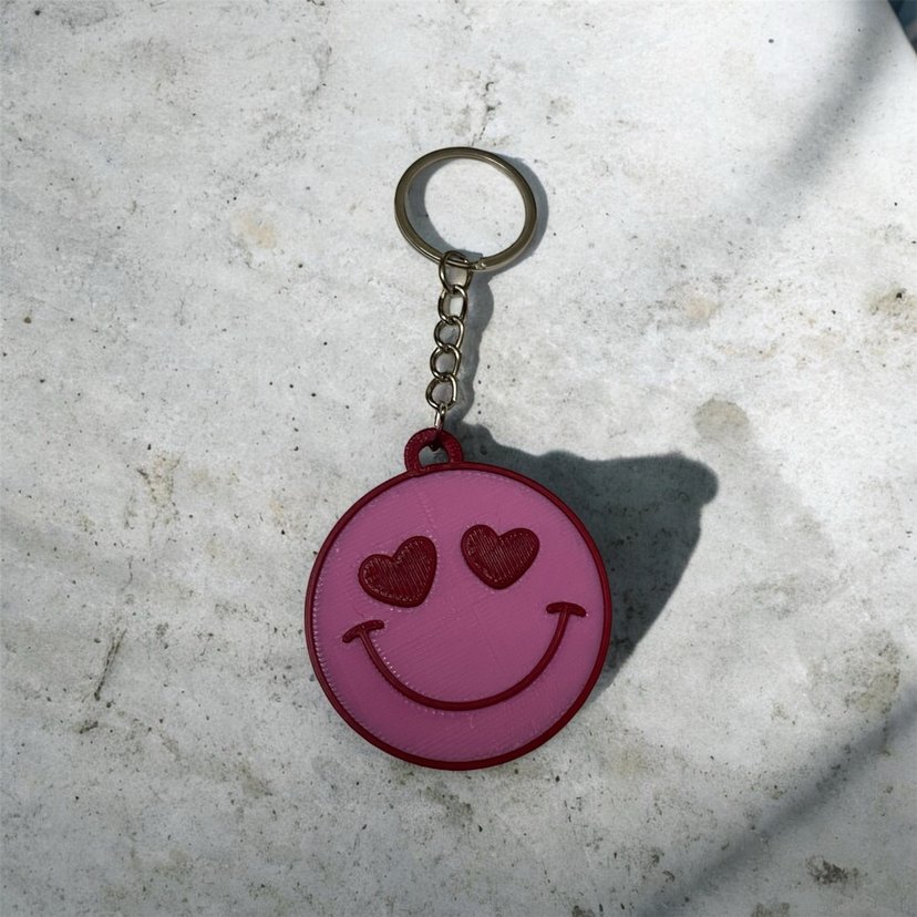Pembe renkli, kalp gözlü gülen yüz figürlü kadın anahtarlık, zincir detayına sahip, minimalist ve punk rock tarzını yansıtıyor.