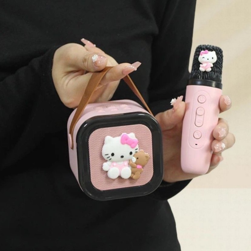 Pastel pembe, rock punk tarzında, baskılı Hello Kitty desenli ve Velcro bantlı kız çocuk aksesuarı. Mikfrofon + hoparlör