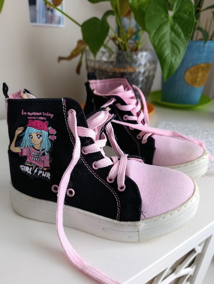 Pembe ve siyah renklerde, renkli rock punk baskılı ve cırt cırtlı kız çocuk spor ayakkabısı. Dayanıklı kauçuk tabanlı.
