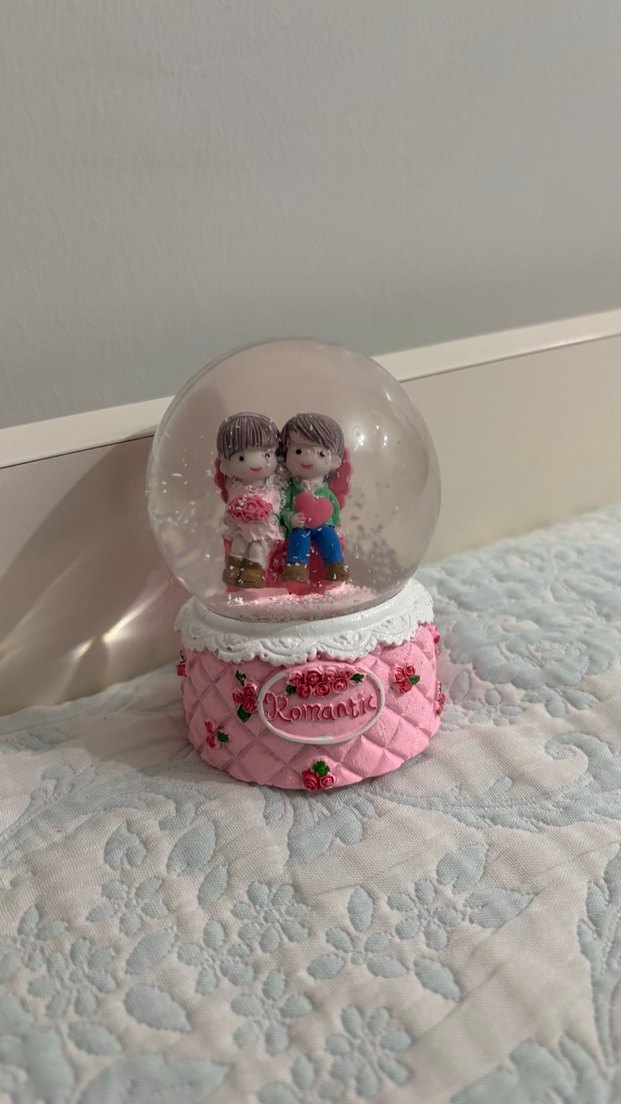 Pembe ve renkli detaylara sahip kar küresi, içinde çift figürü ve çiçek desenli tabanı ile romantik bir tasarıma sahiptir. "Ronanti" yazılıdır. ❄️ RENKLERİ RESİMDEKİ GİBİDİR
