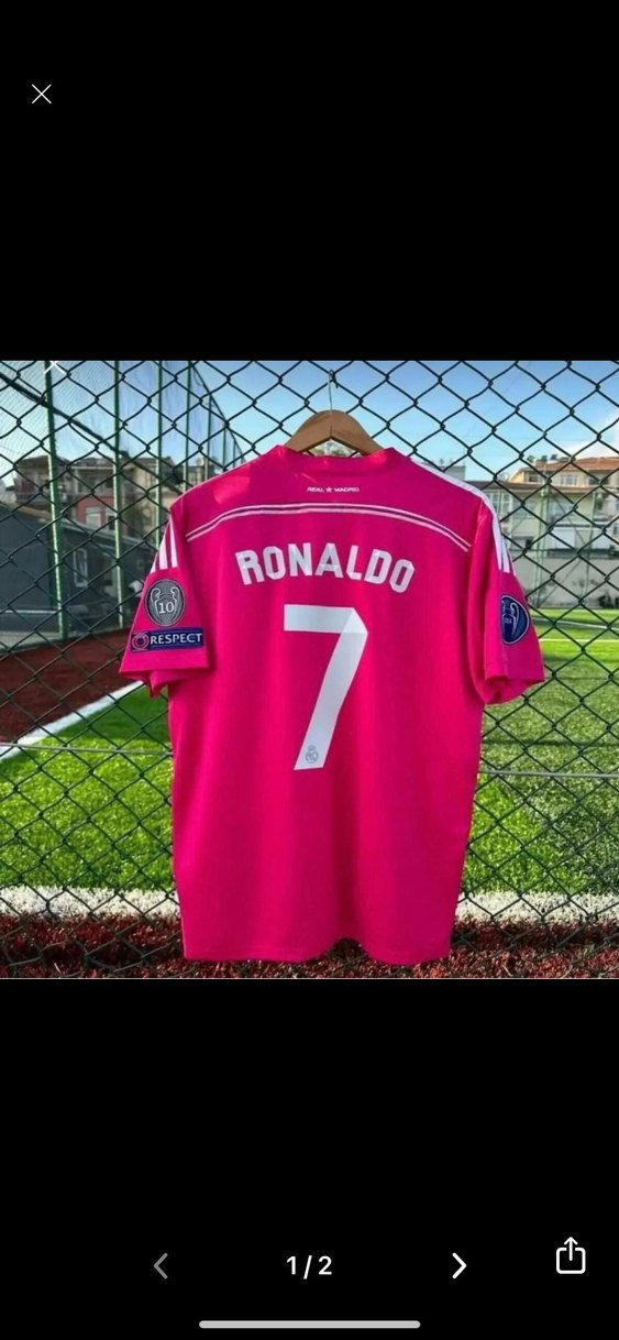 Pembe renkte, crew neck ve kısa kollu erkek spor tişörtü. Sentetik kumaştan, bol kesim ve renkli baskılı. Arkasında 'RONALDO' ve 7 numara yazılı, cırt cırt detaylı. ⚽