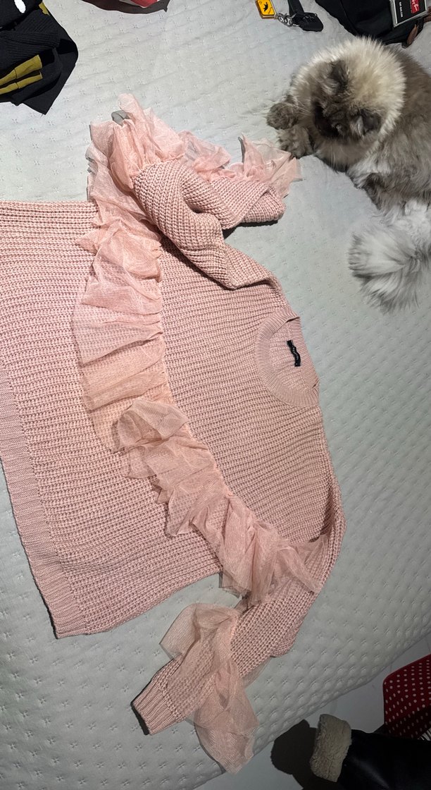 Pastel pembe renkli, uzun kollu, boğazlı ve bol kesim triko kazak. Fırfır detaylarıyla rahat ve şık, günlük sokak stili için uygun. S beden ama boldur
