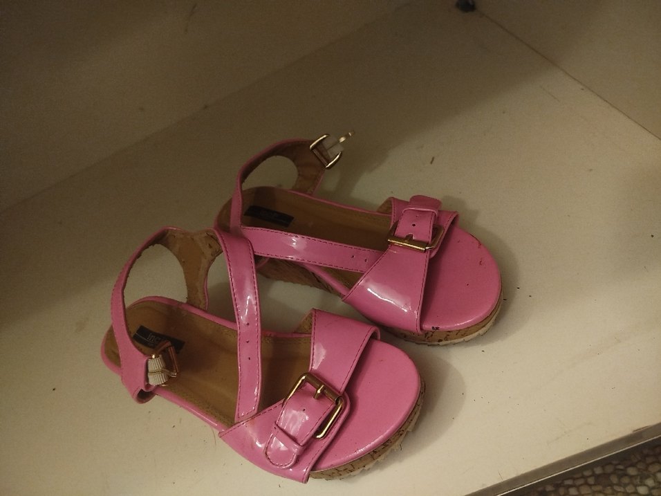 Pembe parlak rugan kadın sandaletler, tokalı kayışları ve kauçuk dolgu topuklu yapısıyla günlük kullanıma uygundur.