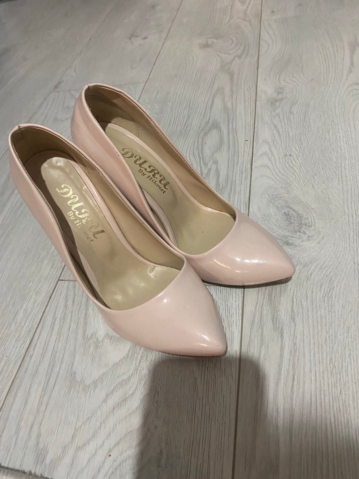 Pastel pembe renkte, modern klasik tasarıma sahip, kauçuk malzemeden üretilmiş stiletto topuklu ayakkabılar. Ofis için uygun, desensiz ve zahmetsiz şıklık sunar.