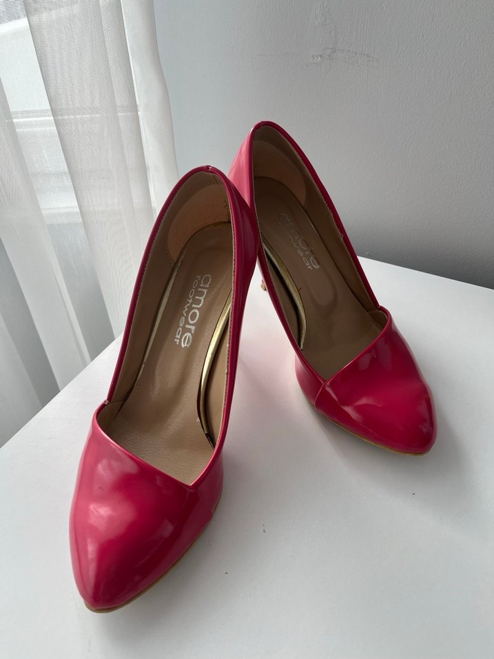 Parlak pembe renkte, lastik tabanlı stiletto topuklu ayakkabılar. İç kısmında 'amore' yazısı bulunur. Ofis ortamına uygundur.