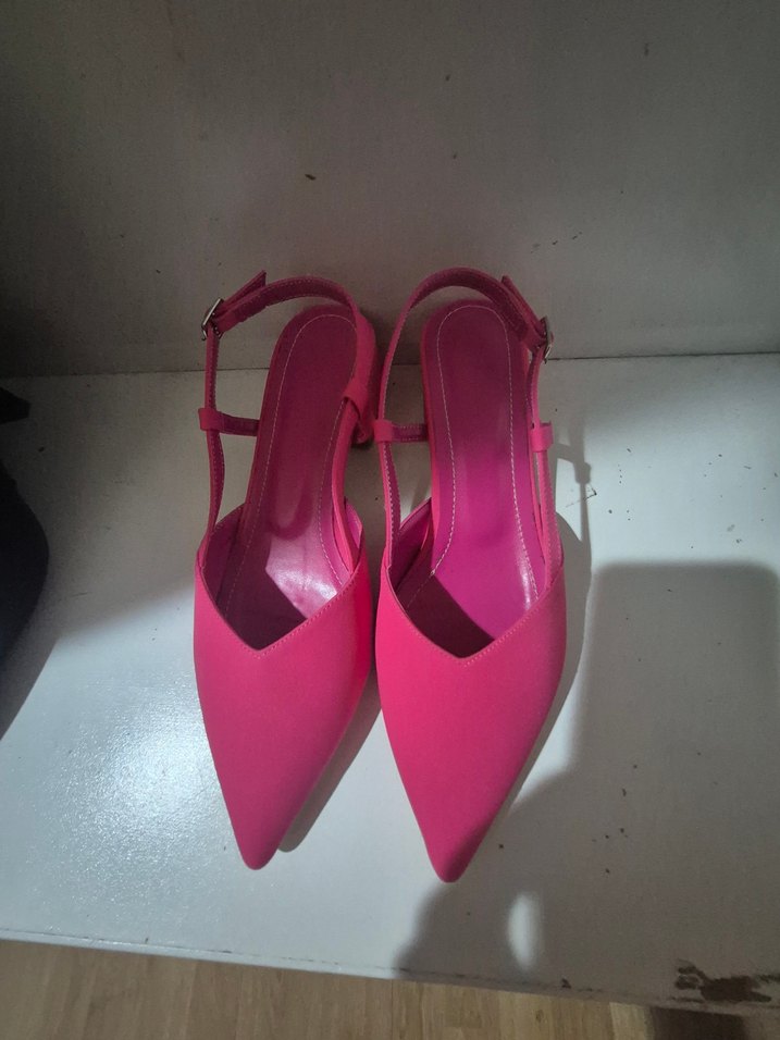 Canlı pembe renkte, tokalı kayışlı, sivri burunlu kadın stiletto ayakkabılar. Kauçuk malzemeden yapılmış, çağdaş ve minimal bir tarz sunar.