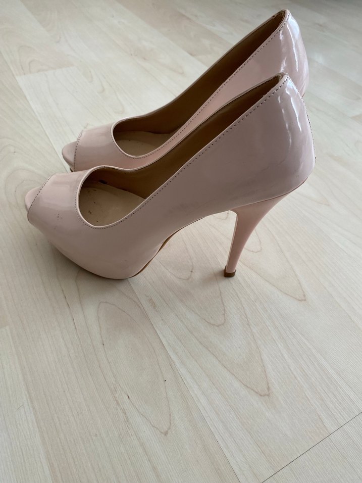 Pembe rugan stiletto topuklu kadın ayakkabı, parlak yüzeyli, minimalist ve desensiz tasarıma sahip, ofis için uygun modern klasik stilde.
