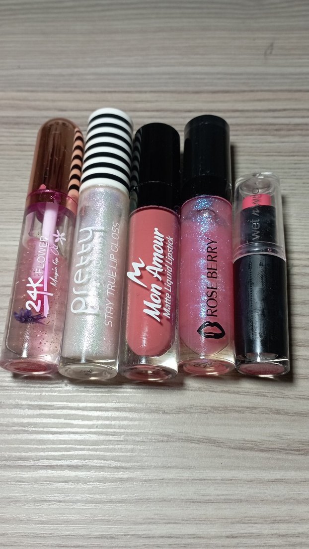 İlk ürün sürdükçe pembeleşen glosstur, cam gibi bir görüntü sunar. İkincisi Flormar markasına ait, mor simli parlatıcıdır, ruj üstüne sürüldüğünde daha güzel görüntü sunar. Üçüncüsü şeftali renginde güzel kokulu bir glosstur, Mon Amour markasına aittir. Dördüncüsü Wet N Wild markasına ait pembe renkli bir rujdur, açık renk sevenlere uygundur. Sonuncusu ise dudak dolgunlaştırıcı glosstur, mentollü olduğu için dudağı yakıyor. Almak istediğiniz ürünler için ayrı ilan açıp fiyatı düşürebilirim bu toplu fiyattır.