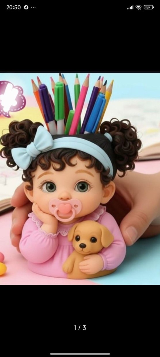 Kıvırcık saçlı, pembe saç bandı ve emzikli kız bebeği tasarlayan pastel pembe kalemlik, küçük bir köpek figürü tutuyor. ️ sıfır silikon kalıp