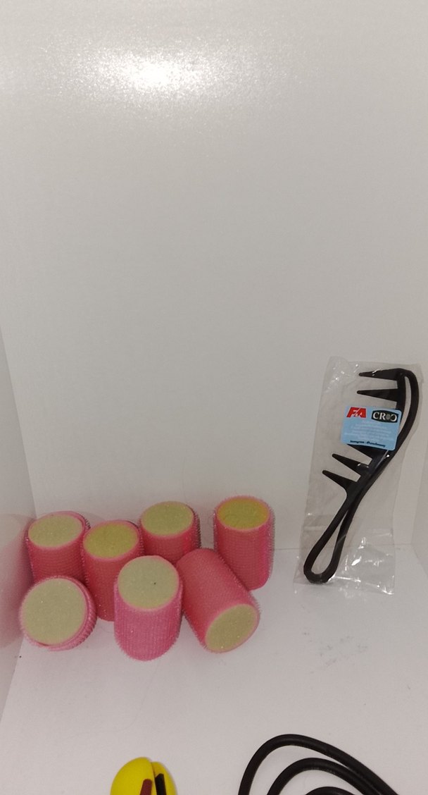 Pembe saç bigudiler ve siyah saç şekillendirici içeren set. Renkli bigudilerle kolay saç şekillendirme sağlar.