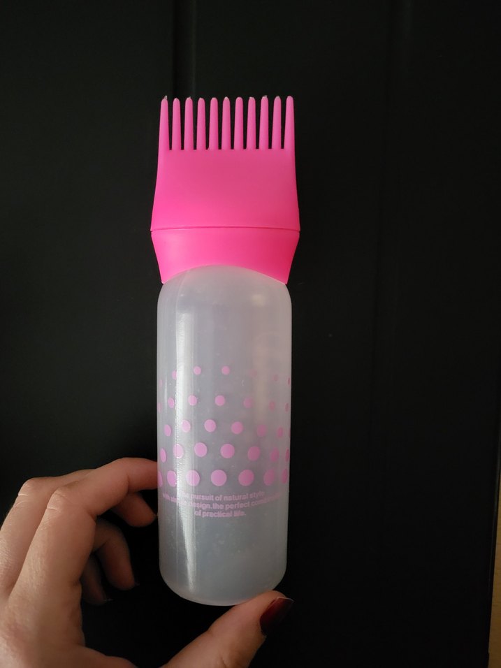 Pembe saç boyama şişesi, kolay uygulama ve eşit dağıtım için taraklı tasarlanmıştır.