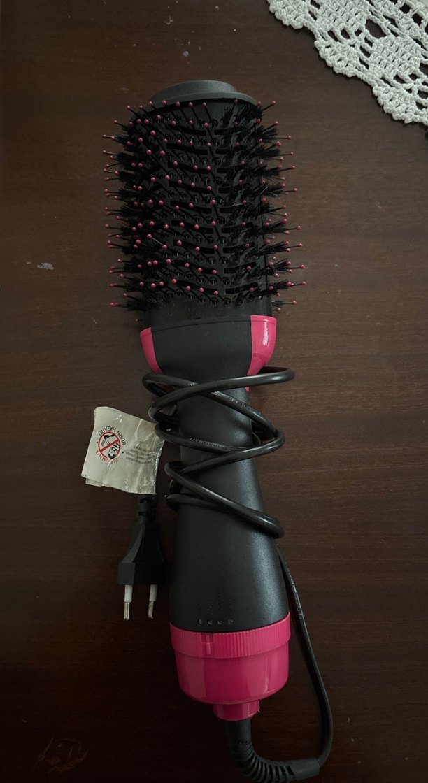 Pembe uçlu kıllara sahip koyu pembe saç düzleştirici fırça, elektrik kablosu ile çalışır. Saçı açmak ve şekillendirmek için kullanılır.
