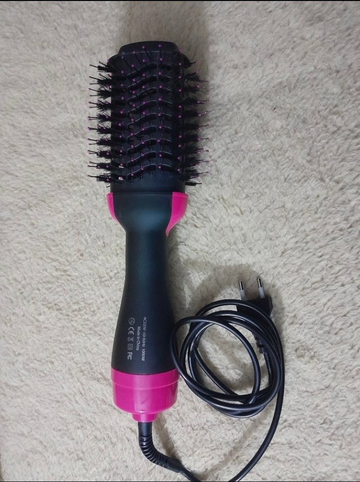 Pembe renkli saç şekillendirici fırça, koyu renk sap ve kıllara sahip, elektrikle çalışan kablolu tasarım.