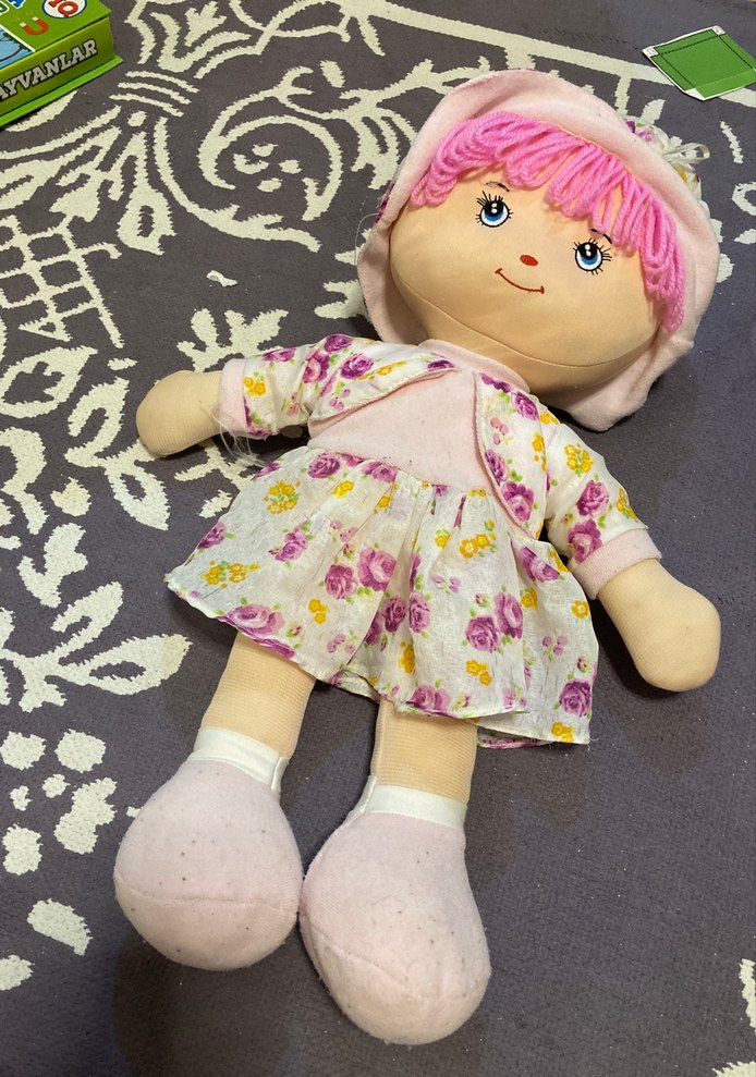 Pastel pembe saçlı, çiçek desenli elbise ve şapka giymiş yumuşak kumaştan oyuncak bebek. Nakışlı yüz ifadesi ile sevimli. Şapkasında ve eteğinde yıpranma var fotoğrafta gösterilmiştir