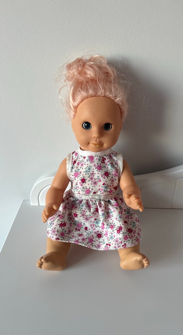 Pembe saçlı bu konuşan bebek, çiçek desenli beyaz elbise giymektedir. Yumuşak ve çocuk dostu tasarıma sahiptir.