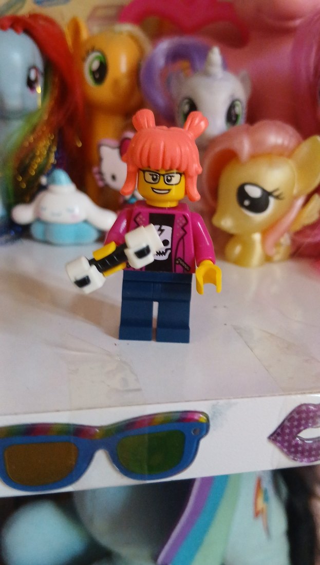 Pembe saçlı, gözlüklü ve beyaz aksesuar tutan renkli Lego figürü. Üzerinde baskılı tişört ve koyu pantolon var.