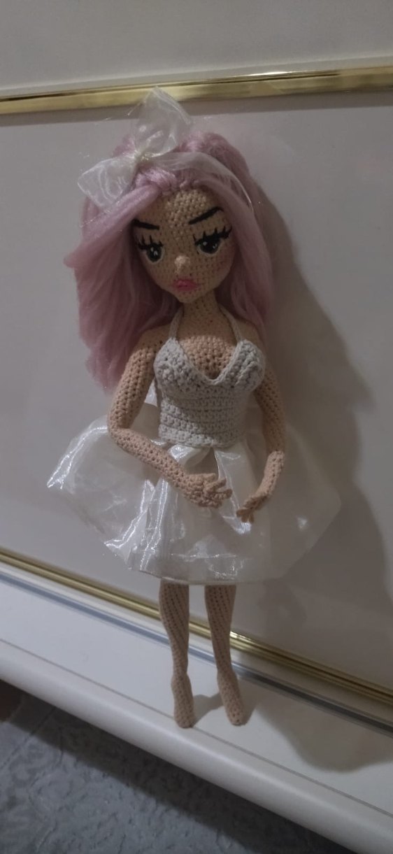 Pastel pembe saçlı, beyaz elbiseli el yapımı örgü oyuncak bebek. Detaylı yüz dikişleri ve yumuşak kumaş kullanılmış. İstek üzerine yapılacaktır